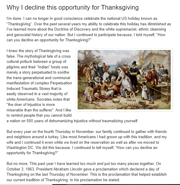 KEY QUOTE: “I am no longer interested in reclaiming the US holiday known as ‘Thanksgiving,’ From here on out, the fourth Thursday in November is set aside as a day of mourning. A day of lament…From now on, in my calendar, the fourth Thursday in November is reserved to mourn the fact that we live in a country that, in 1863, established a national day of Thanksgiving for fruits of a genocide we were actively committing.”