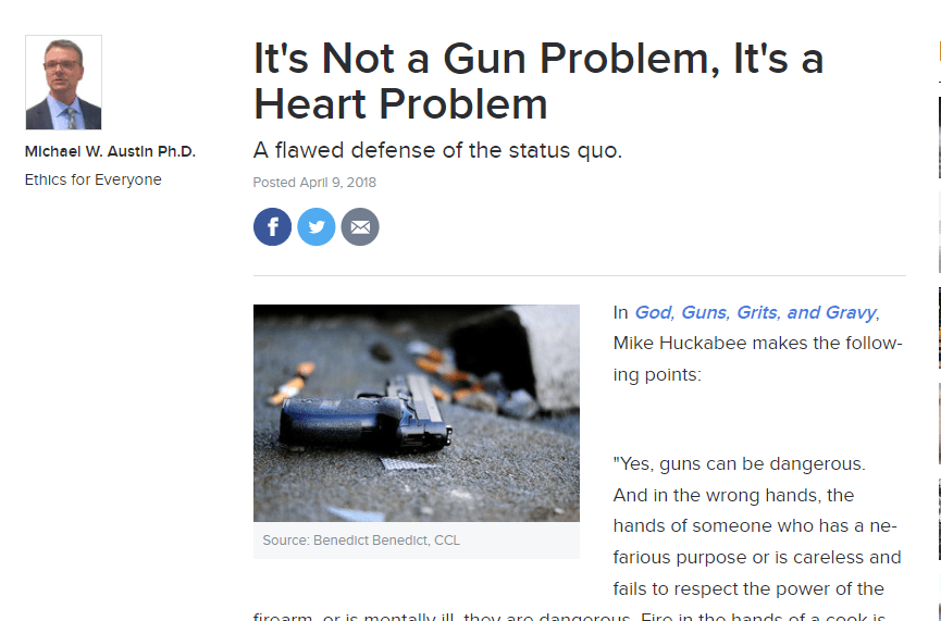 SUMMARY: In a well-reasoned, succinct article, professor of philosophy at Eastern Kentucky University Michael W. Austin lists four reasons why the common argument, “Guns don’t kill people, people kill people,” is fallacious.