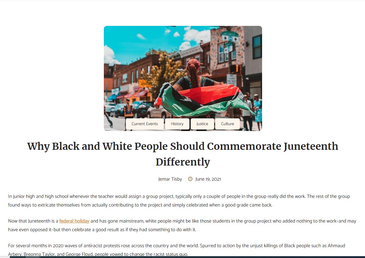 KEY QUOTE: “Maybe ‘commemoration’ is a better word than ‘celebration’ for white people to use when it comes to Juneteenth. They should certainly commemorate it, pause to acknowledge the historical importance of the day, but a pure celebration seems presumptuous.”