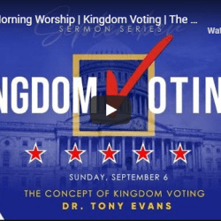Using a football game with two teams (the warring ideologies of culture), officials (Christians), a rule book (the Bible), and a crowd (the people of the world) as analogies for how Christians should engage in politics Oak Cliff Bible Fellowship (Dallas, TX) pastor Tony Evans preaches from Joshua 5:13-15 as he details a distinct perspective God has on voting. Go 24 minutes in to start the sermon.